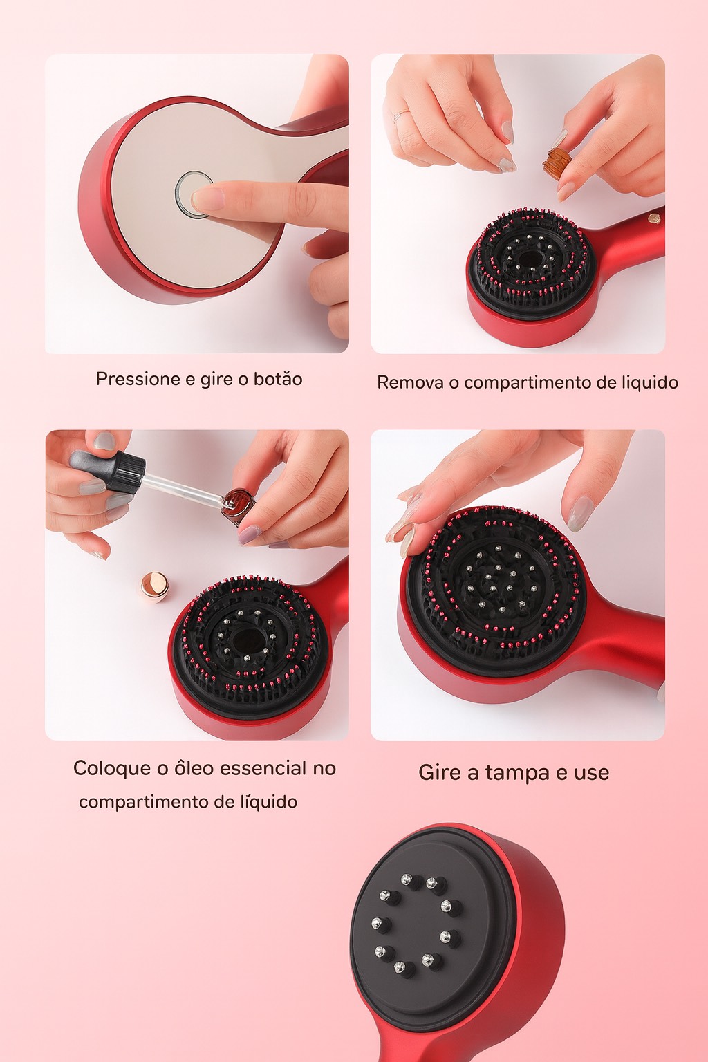 Com design inteligente 2 em 1, ela combina massagem relaxante com tecnologia de luz vermelha, estimulando o couro cabeludo e fortalecendo os fios desde a raiz.